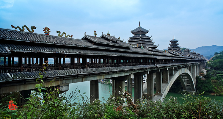風(fēng)雨橋(又稱“花橋”)橫跨溪流,既是交通要道,也是侗族人乘涼、對(duì)歌、社交的場(chǎng)所,橋身雕刻精美,充滿藝術(shù)氣息。