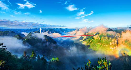 矮寨大橋飛越在德夯峽谷之巔,是世界跨峽谷跨徑最大的鋼桁梁懸索橋,大橋跨徑1176米,橋面距離峽谷底部355米。2007年10月開始修建,2012年3月建成通車,總造價(jià)15億元。大橋以克服了五大“世界級”施工難題和創(chuàng)造了四項(xiàng)“世界第一” 的高科技含量享譽(yù)中外,被贊為橋梁建筑藝術(shù)和自然景觀完美結(jié)合的典范。矮寨大橋不只是連接湘渝的重要交通設(shè)施,更是湘西的標(biāo)志性景點(diǎn)。