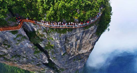 棧道全長1600米,平均海拔為1400米,起點(diǎn)是倚虹關(guān),終點(diǎn)到小天門。與其他棧道不同的是,鬼谷棧道全線既不在懸崖之巔,也不在懸崖之側(cè),而是全線都立于萬丈懸崖的中間,給人以與懸崖共起伏同屈伸的感覺。   站在棧道上俯瞰群山,古人“會(huì)當(dāng)凌絕頂,一覽眾山小”的感覺油然而生。由于天門山是國家森林公園,植被特別豐富,加上典型的喀斯特地貌,所以,在這條棧道上更能找到一種在乘坐直升飛機(jī)飛越熱帶雨林大峽谷的感覺,這平時(shí)只能在電影里看到的場景,在這里能讓你身臨其境。   由于海拔和氣流的影響,很多小鳥都不能到達(dá)與棧道平行位置。所以,站在這里,腳下是沒有邊際的綠野,成群的小鳥在峽谷中嬉戲,偶爾有老鷹從眼前掠過,閉上眼,挺著發(fā)麻的雙腿,帶著急促的心跳,伸開雙臂,你就能得到一次最完美、最刺激、最貼近自然的SPA。因?yàn)椋肋@種在懸崖上賞風(fēng)景一般都是非人類所能享受的。   如果是雨前雨后,在棧道上則是身邊霧氣盤繞,腳下云海翻騰,令人抬腿似生霧,邁步如踏云,人間天界,世外洞天也就是如此了。   據(jù)施工人員介紹,此條棧道也是他們所修棧道中施工最難,最險(xiǎn)峻的一條。如果您還覺得不夠刺激的話,在棧道的完結(jié)處的兩個(gè)懸崖之間有一條長160米的懸索吊橋,同時(shí),在海拔最高點(diǎn)還有一個(gè)挑戰(zhàn)心里極限的玻璃站臺(tái),在這里,如果你能挺直腰板伸開雙臂,那么,您就是真正的勇士了。
